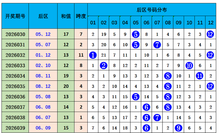 近10期开出0路号码7枚,1路号码4枚,2路号码9枚;上期开出0路号码06、09。结合分析,本期关注0路、1路号码热出,后区两码参考:04、09。